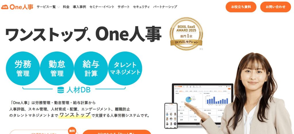 「One人事」は、人事評価から労務、勤怠、給与、タレントマネジメントまでを「One ID/One UI/One DB」で一元管理できるオールインワン型システムです。